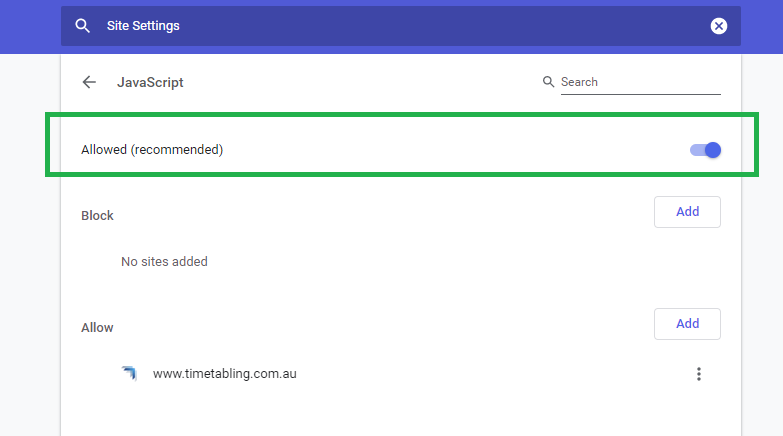 3. A list will display, change the JavaScript setting to allowed (or alternatively, leave blocked but click Add and enter www.timetabling.com.au as an allowed site)