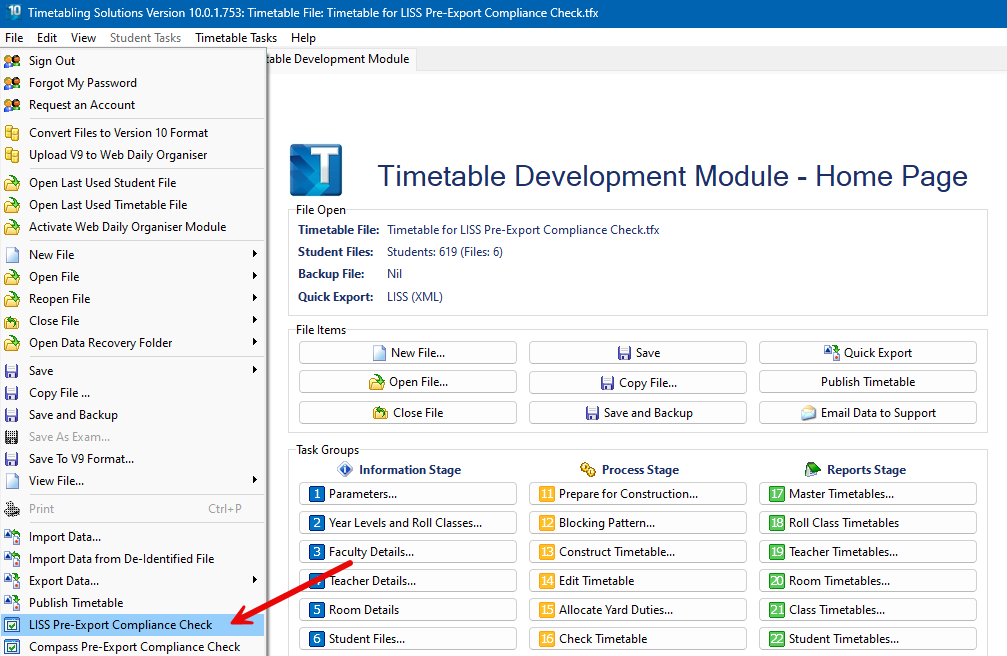 11. Go back to the Timetable Development Home Page and try the LISS Pre-Export Compliance Check again.