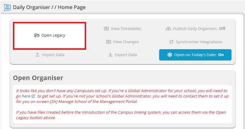 In the Management Portal, we have introduced campuses and academic years, which define the data sets for the Daily Organiser.