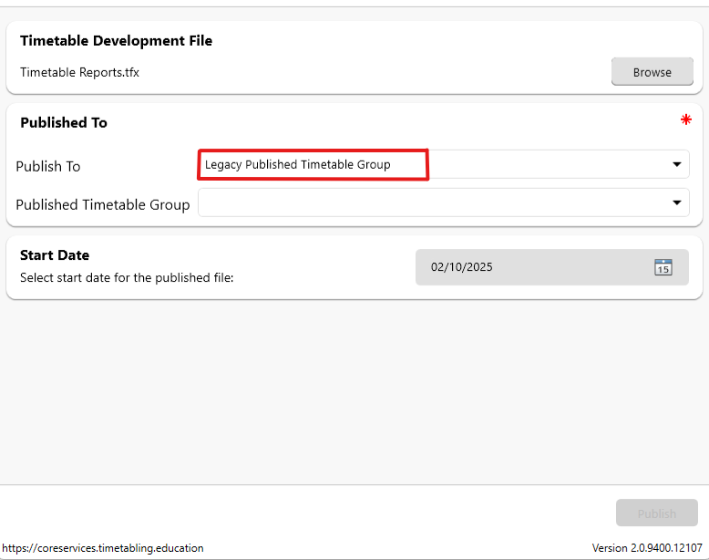 The Publish dialog also looks quite different. The main difference is that you need to select Publish To: Legacy Published Timetable Group. In the subsequent drop-down box, select whichever published timetable group the school wants to publish, enter the Start Date, and press Publish.