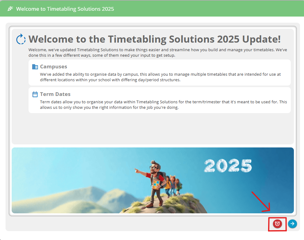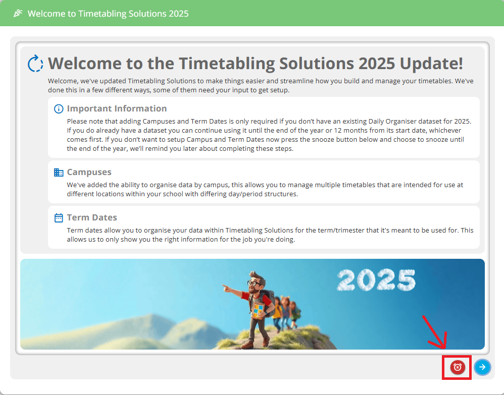 When presented with the screen below, simply press the red Snooze button, as this is not relevant for the time being. Once you wish to create a Daily Organiser dataset for 2026 and the 2026 timetable is finalised, you would need to follow the steps listed in the wizard to create the Campus and 2026 Academic Year.